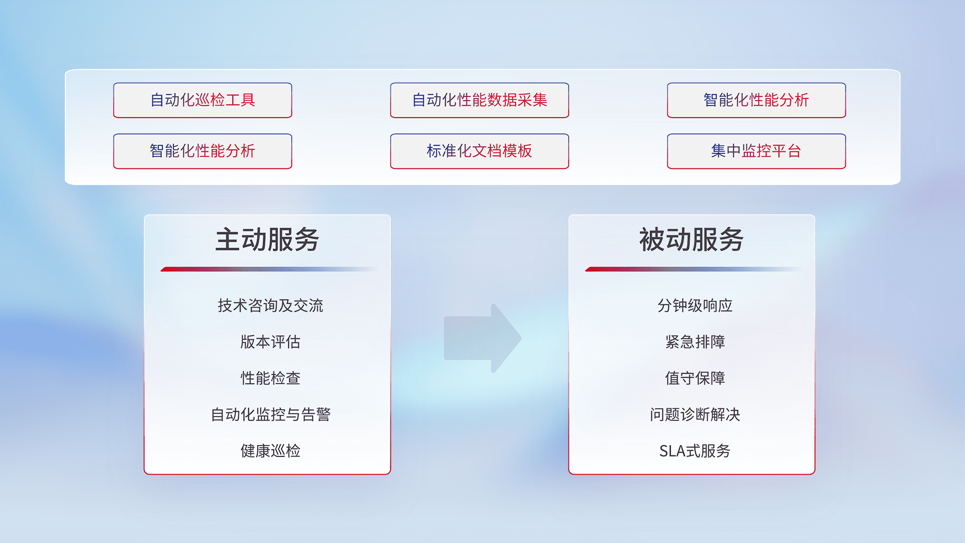 智能化工具和标准化文档,,,,保障服务质量,,提供主动服务(包含技术咨询、、版本评估、、、性能检查、、、自动化监控与告警、、健康巡检)和被动服务包含(分钟级响应、、、紧急排障、、、、值守保障、、、、问题诊断解决、、SLA服务)。。。