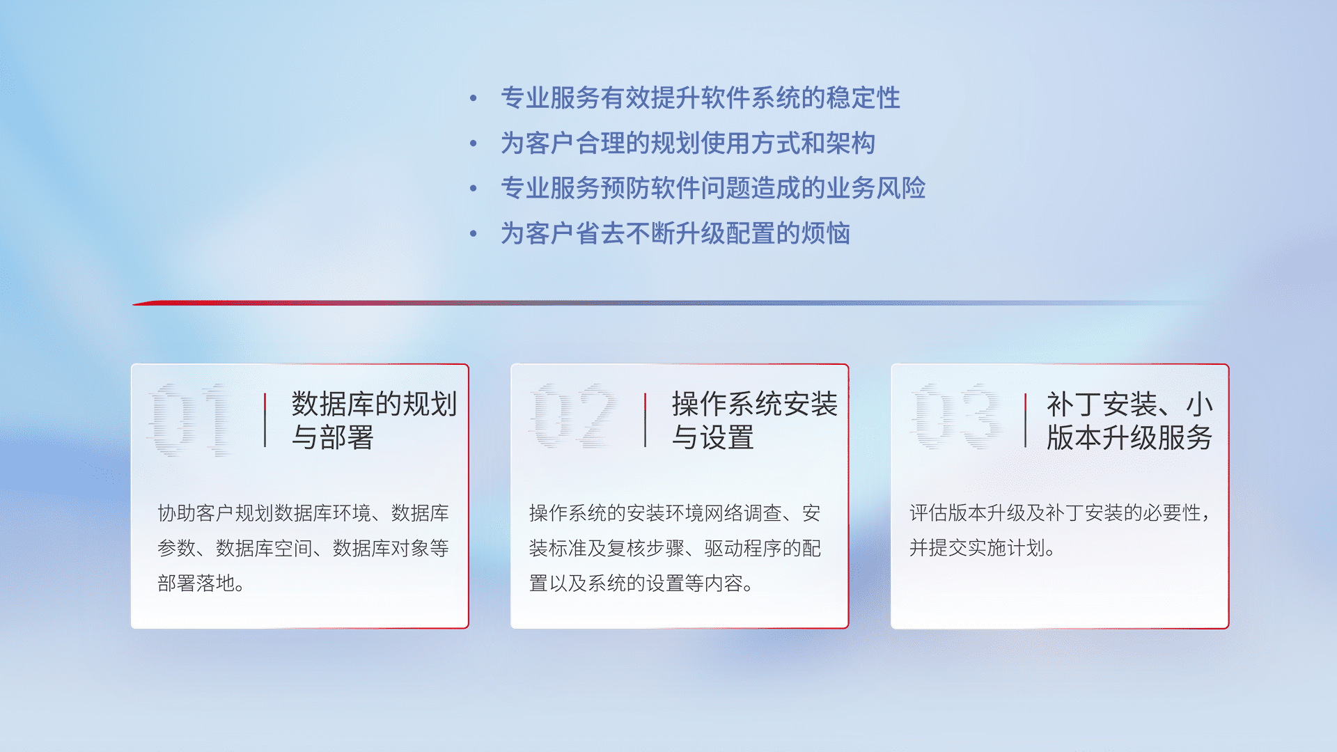 为客户提供软件规模升级、、快速部署、、、按需配置的专业服务,,,,从数据库的规划与部署到操作系统的安装与设置,,再到补丁安装和小版本升级提供支持。。