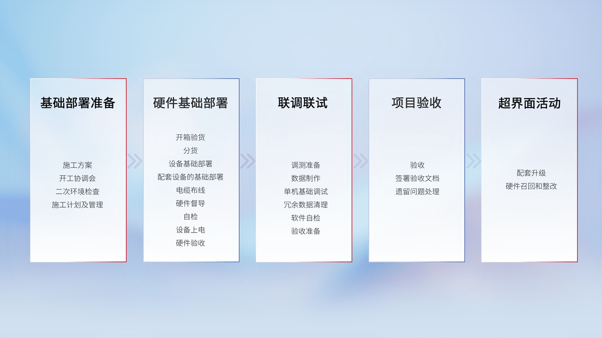 从基础部署准备、、、、硬件基础部署、、联调联试、、、、项目验收、、越界面活动的全过程可追溯,,保证施工质量和进度。。
